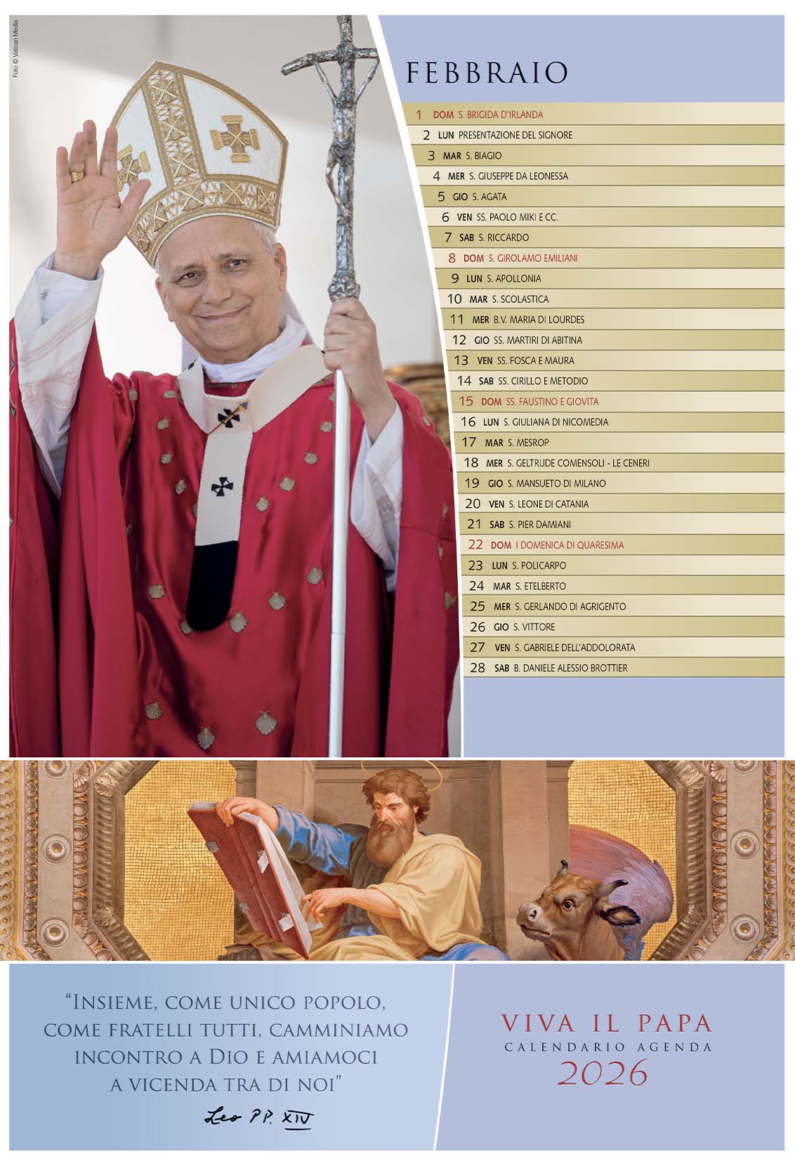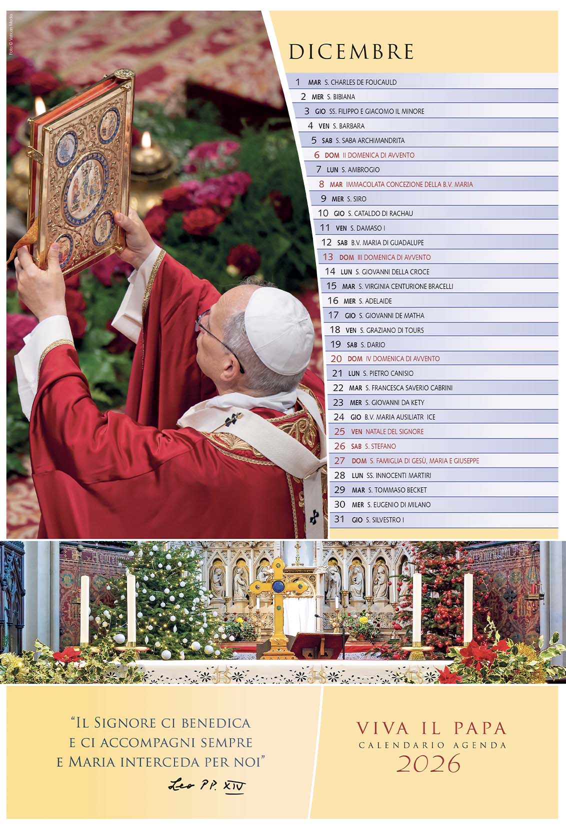The calendar celebrates Pope Francis, one of the most innovative pontiffs in the history of the Catholic Church. A valuable publication that will accompany you throughout the year, containing emblematic images, which will make you even more familiar with Francesco's influential personality thanks to his most profound and significant phrases. With the principal saints of the Roman liturgical calendar. And there is plenty of space to take note of all the commitments of the year.